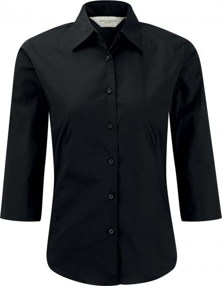 De Popeline-bloes is ontworpen met 97% katoen en 3% elastaan voor een perfecte combinatie van comfort en rekbaarheid. Het is gemakkelijk te onderhouden en heeft een knoopsluiting met 7 kleurige knopen die bij de kleur van de bloes passen. Er zijn knoopsluitingen aan de achter- en voorkant voor een perfecte pasvorm bij de natuurlijke vormen van vrouwen. De klassieke kraag met één knoop en mouwen tot de ellebogen met gesplitste manchetten maken dit tijdloze en elegante model af.