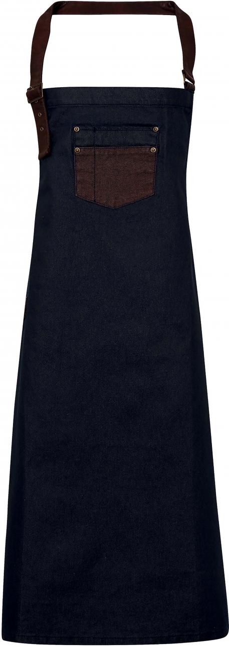 De denim 100% katoenen schort met een acrylafwerking biedt een vintage en authentieke look dankzij de lange duurzaamheid van de olie-effect. De kleur wordt verkregen door geweven en geverfde draden. Contrasterende inzetstukken en leren details geven deze schort een trendy look die zowel professionals als klanten aantrekt. De bevestigingsbanden zijn van imitatieleer en de bevestigingsband bij de hals is verstelbaar met een gesp. Afmetingen: H 86 cm x B 72 cm.
