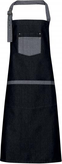 Dit industriële schort dat tegelijkertijd stijlvol en praktisch is, is samengesteld uit 70% katoen en 30% polyester. Het heeft grote metalen oogjes bij het vergrendelingssysteem, en de contrasterende achterkant is zichtbaar op de zakken en de vergrendelingen, voor een omkeerbare stijl. Een metalen verstelbare sluiting aan de hals zorgt voor een aanpassing van de lengte van het schort, en het heeft een centrale 36 cm denim zak met contrasterende afwerking, evenals een pennenvak. De contrasterende vergrendelingsbanden (100 cm lang) en het vergrendelingssysteem met metalen oogjes maken dit schort compleet, dat 86 cm hoog en 72 cm breed is.